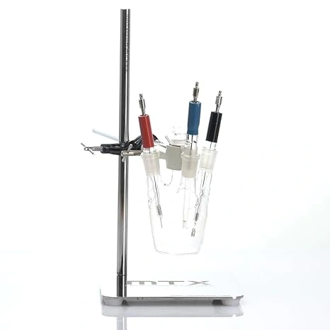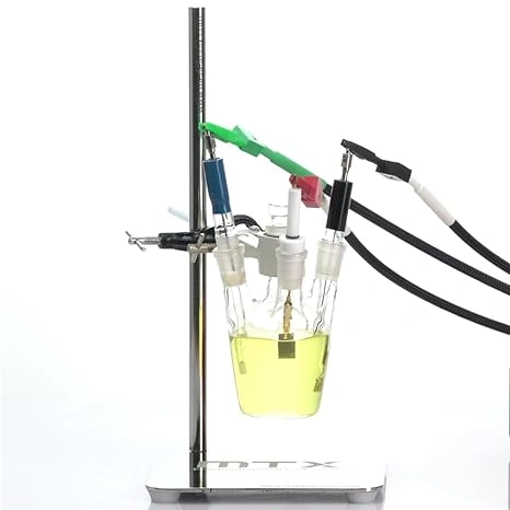 These electrochemical cells, designed with a 100 mL volume capacity, incorporate a conical cell type featuring a gas-tight fitting and four necks (4 B14) crafted from robust borosilicate glass. The presence of electrode holes enhances adaptability to different experimental setups, providing increased versatility. The apparatus is characterized by easy handling, ensuring user-friendly operation. With applicability in a moderate temperature range from 0 to 100°C, it accommodates a diverse range of experimental conditions. Notably, it comes equipped with one B14 stopper for conducting experiments in inert conditions. The maximum temperature tolerance of 100°C further enhances its suitability for controlled environments and varied research requirements.