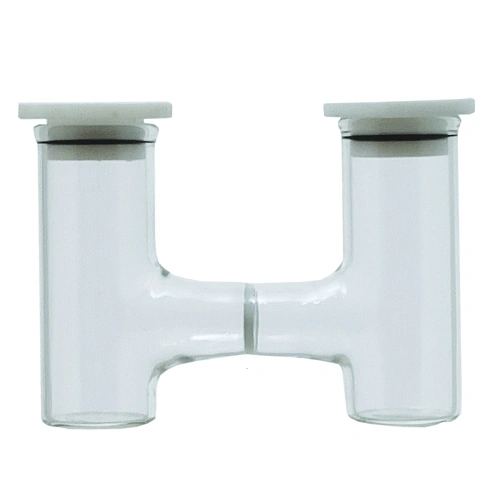 This H-cell is ideal for those experiments where it is necessary to isolate the working electrode from the counter electrode. It is also called a two-compartment cell. Both the compartments are separated by a sintered glass frit which stops bulk mixing of the liquids in both the compartments.