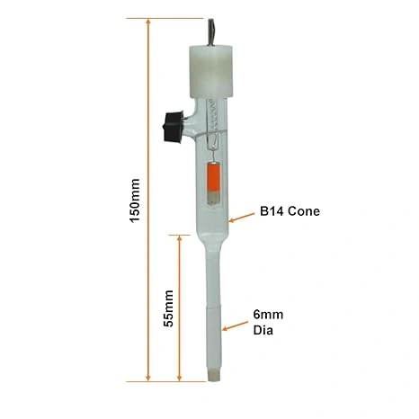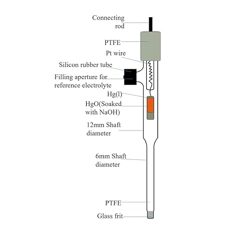 This Hg/HgO/OH- reference electrode is ideal for use in alkaline or fluoride media. The electrode is supplied with electrolyte filling. The side plug arrangement makes it easy to replace the filling solution