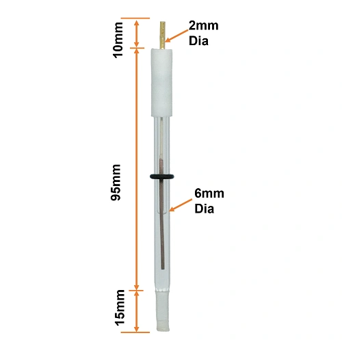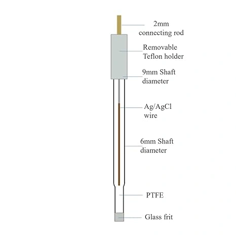 The Ag/AgCl reference electrode with a Vycor porous frit provides accurate Electrochemical measurements in neutral and slightly acidic environments. Its strong construction and use of high-quality materials assure long-term durability and minimum potential drift. The 3M KCl electrolyte filling, along with the ability to easily refill with specific concentrations, provides researchers with unparalleled flexibility for tailored experimental conditions. The PTFE holder adds mechanical stability, reducing the risk of breakage during handling. Its non-stick nature facilitates easy cleaning, preventing contamination between experiments. Compatible with the standard borosilicate glass body 6mm diameter. The gold-coated copper connecting rod helps to link the electrodes to potentiostat and galvanostat for precise control of potential and current.