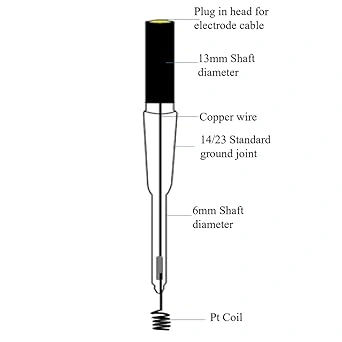 The electrode contains a coiled platinum wire fused in a glass tube. This precise design control, easy integration, chemical inertness, corrosion resistance, and high-temperature stability, make them versatile for various setups. Its main job is to act as a counter electrode, playing a crucial role in a variety of electrochemical measurements. What makes it special is the addition of a standard ground joint (14/23), making it even more useful. This design choice ensures easy assembly with MTX electrochemical cell tops. The combination of its precise design and compatibility makes this electrode very convenient and versatile, making it a great choice for many different types of electrochemical experiments. Banana connector pin 4mm helps to link the electrodes to potentiostats and galvanostats for precise control of potential and current. The fused Pt with glass body increases the utility of electrode multiple times. Since the fused part airtight with Pt surface, it allows user to dip the electrode along with its lower glass body without any contamination