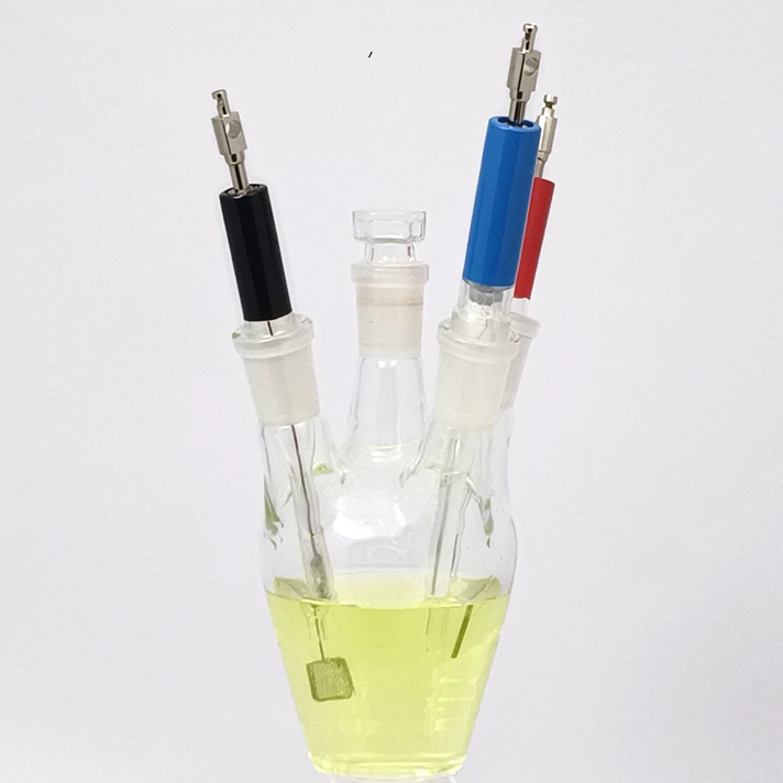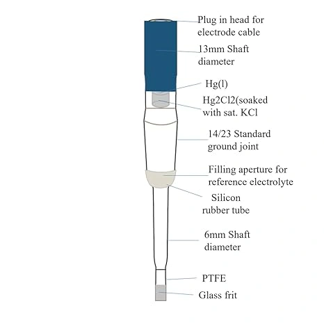 The Saturated Calomel Reference Electrode with a Vycor porous frit provides accurate electrochemical measurements in neutral and slightly acidic environments. Its strong construction and use of high-quality materials assure long-term durability and minimum potential drift. The Saturated KCl electrolyte filling, along with the ability to easily refill with specific concentrations, provides researchers with unparalleled flexibility for tailored experimental conditions The standard ground joint (14/23) ensures easy integration with MTX electrochemical cell tops, making it an essential tool for a wide range of electrochemical applications. Banana connector pin 4mm helps to link the electrodes to potentiostat and galvanostat for precise control of potential and current.